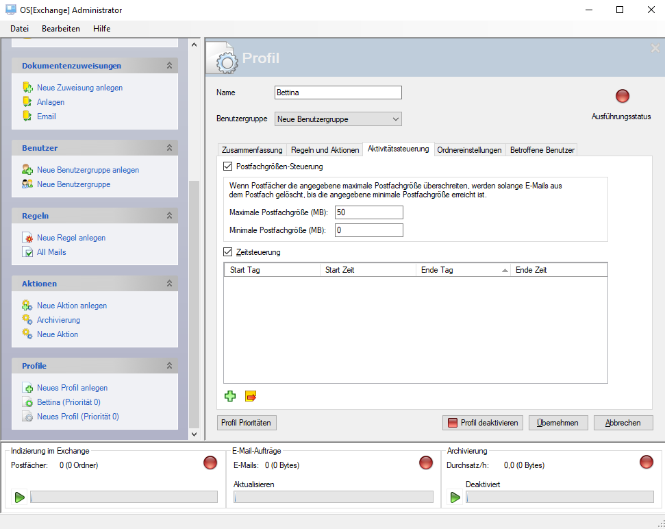 Über diesen Bereich fügen Sie die vorangehenden Konfigurationen von Dokumentenzuweisung, Benutzergruppe, Regeln und Aktionen zu einem Profil zusammen, das zeitgesteuert oder aus dem enaio® exchange-administrator ausgeführt werden kann.