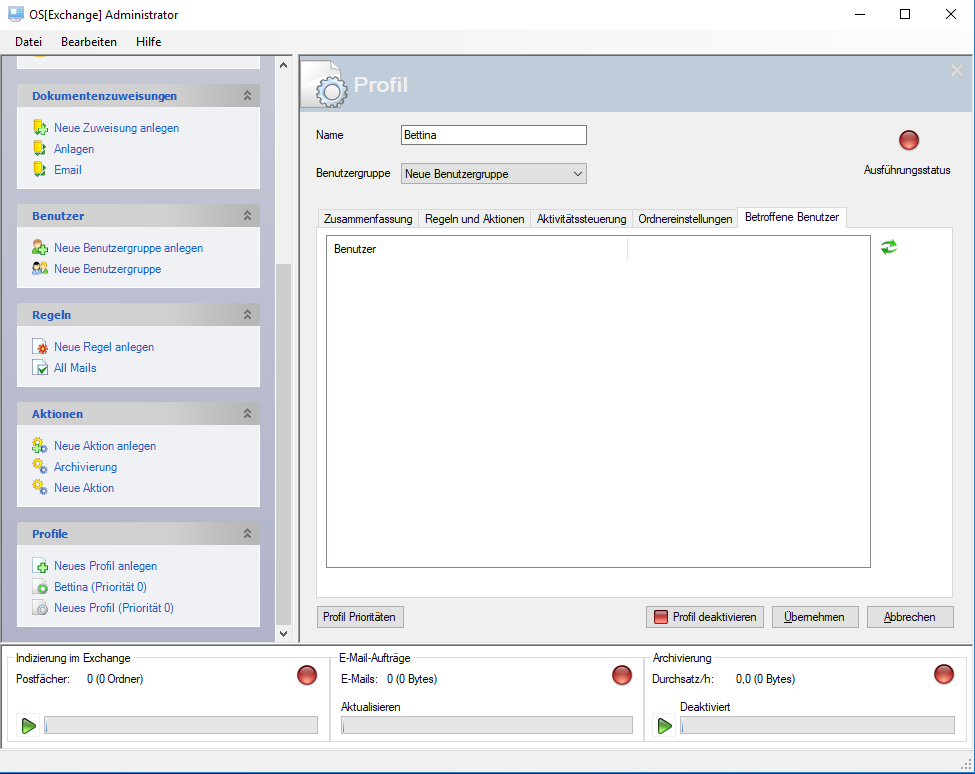 Änderungen an Profilen sind nur möglich, wenn das Profil nicht aktiv ist. Vor Änderungen sollten Sie allgemein die Indizierung anhalten.