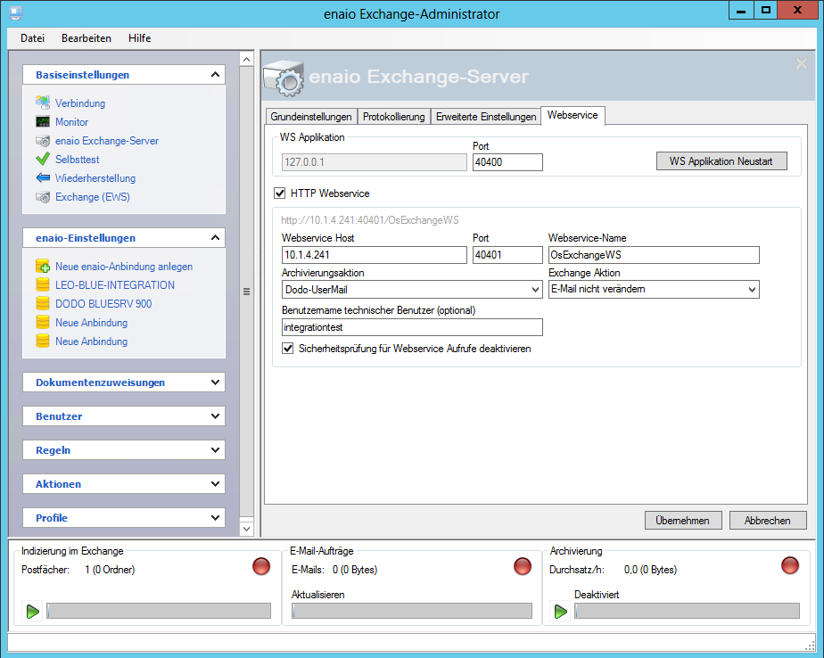 Hier stellen Sie die Verbindung zum enaio® exchange-server her und trennen Verbindungen wieder.