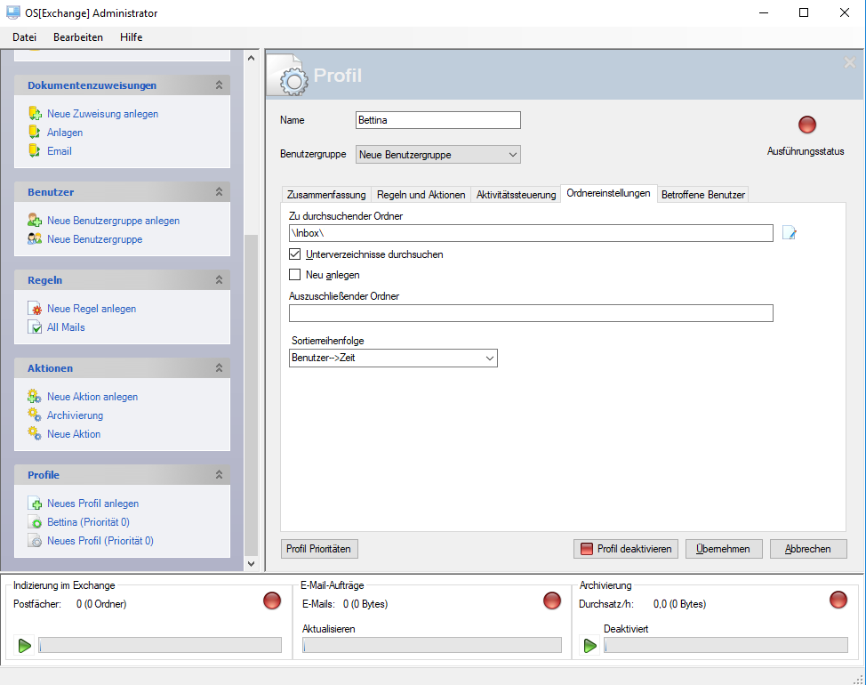 Änderungen an Profilen sind nur möglich, wenn das Profil nicht aktiv ist. Vor Änderungen sollten Sie allgemein die Indizierung anhalten.