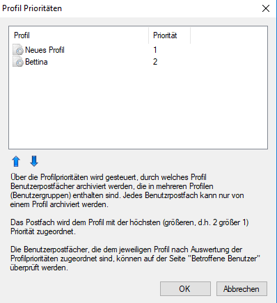 Über die Schaltfläche Profil Prioritäten öffnen Sie einen Dialog, der die Prioritäten anzeigt. Wenn Sie ein Profil markieren, können Sie dessen Priorität über Pfeil-Schaltflächen ändern.