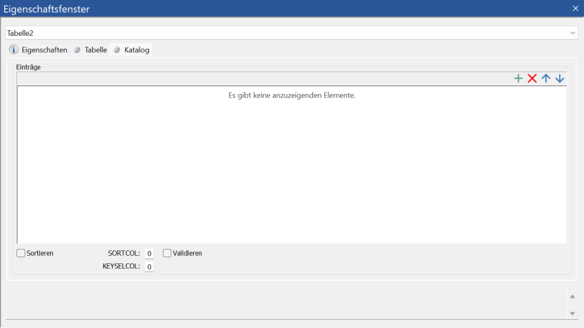On the Catalog tab, enter the list values for the selected column in the field row by row. A new line is added by clicking the + icon or the Ins key. List values can be moved up and down using the arrow keys. Use the x key or x icon next to each line to delete lines.