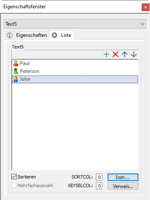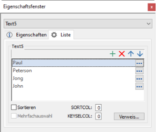 Wählen Sie über das Eigenschaftsfenster eines Textfelds in der Zeile Katalog den Eintrag Liste oder Liste (mehrsprachig), wird die Registerkarte Liste angelegt.
