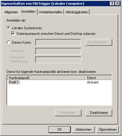 Haben Sie enaio® filetrigger unter einem lokalen Systemkonto installiert, muss in den Eigenschaften des Diensts die Option Datenaustausch zwischen Dienst und Desktop zulassen aktiviert sein.