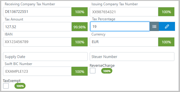 Die Maske Extraktion wird angezeigt. Die extrahierten Indexdaten werden jeweils mit ihren Wahrscheinlichkeiten angezeigt. Eine Angabe von 99 % bedeutet z. B., dass die KI den Wert zu 99 % richtig erkannt hat. Das Symbol