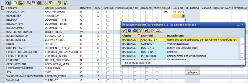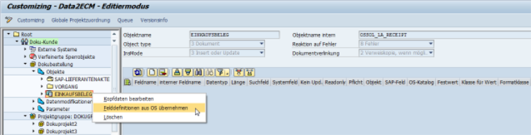 Die Felddefinition kann manuell (über die Standard-SAP®-Funktionen) erfolgen oder aus dem enaio® übernommen werden.