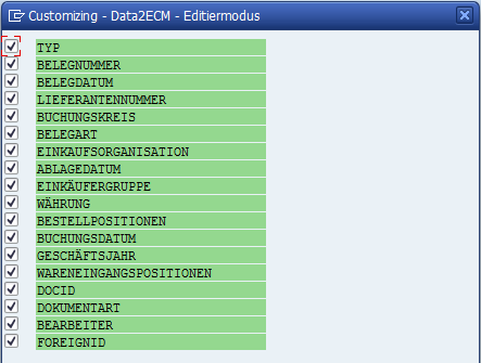 Die Icons hinter der Feldlänge symbolisieren den enaio®-Datentyp. Für Checkboxen wird automatisch die Formatklasse /OSGMBH/DX_FRM_XFLAG_TO_INT (für die Umwandlung von X in 1) eingetragen.