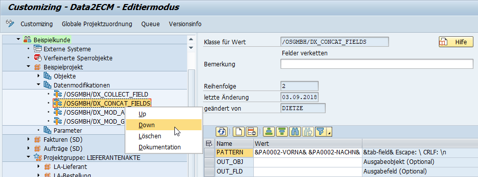Über das Kontextmenü von Datenmodifikationen (im Projektbaum unter Objekte) können Modifikationsklassen hinzugefügt, in ihrer Reihenfolge geändert und gelöscht werden.