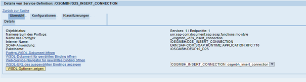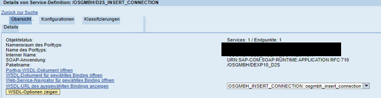 Durch Klicken auf WSDL-URL des ausgewählten Bindings anzeigen wird diese auf der rechten Seite der Arbeitsfläche eingeblendet. Dieser Link ist die Grundlage für die weiteren Aktivitäten zum Test und Aufruf des Service. Er sollte kopiert und separat abgelegt werden.