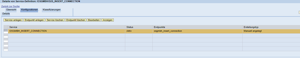 Unterhalb der Trefferliste erscheint eine Detail-Übersicht. Dort wird der Tab Konfiguration gewählt. Es erscheint eine Tabelle. Dort muss zum Schluss der Arbeiten ein aktiver Service stehen. Eventuell wurde durch die vorgelagerten Schritte und den Wizard bereits ein gültiger Eintrag erzeugt. In diesem Fall müssen Sie keinen neuen Service anlegen sondern müssen den vorhandenen Eintrag lediglich bearbeiten. Dies wird weiter unten beschrieben.
