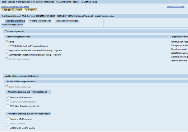 Andere Einstellungen sollen hier nicht vorgenommen werden. Falls Sie andere Einstellungen hier vornehmen, benötigen Sie genaue Kenntnisse, wie sich dieses auf die Authentifizierung beim Aufruf des Service auswirkt. Falls Ihnen dies nicht genau bekannt ist, wird der Aufruf nicht funktionieren.