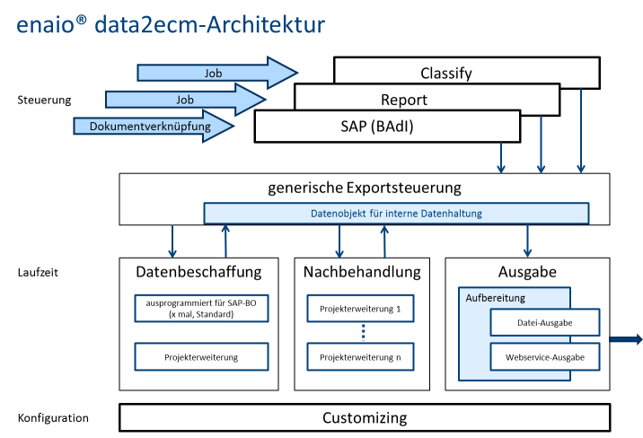 In the output controller which is pre-programmed and cannot be replaced, the SAP® data is evaluated by means of an enaio®-based configuration and transferred to the export data structure.
