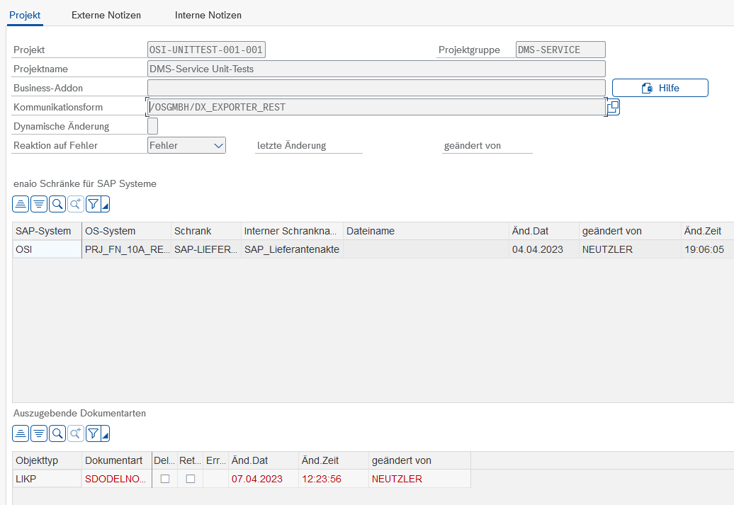 In the project settings, the communication form must be aligned to the respective enaio® system, that is, /OSGMBH/DX_EXPORTER_REST for connection via the 'dms' service. The business add-on remains empty; it is not used. All relevant SAP® systems must be assigned to the respective enaio® system and the relevant cabinet from which the original objects originate.