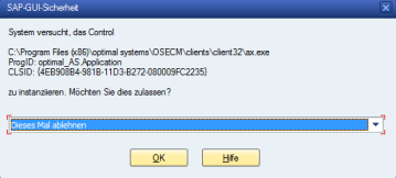 You will need to change the security settings for SAP GUI to avoid having to confirm the security message every time. In version 7.20, these are located in the Control Panel under 'Appearance and Customization > SAP GUI Configuration > Security > Security Settings'. Here, either suitable rules can be set or the evaluation of the security rules can be disabled.