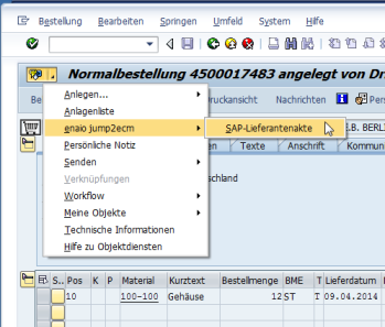 enaio® jump2ecm is a generic object service in SAP that allows you to jump from the currently displayed business object (business partner, posting document, invoice document, etc.) to a record in enaio®.