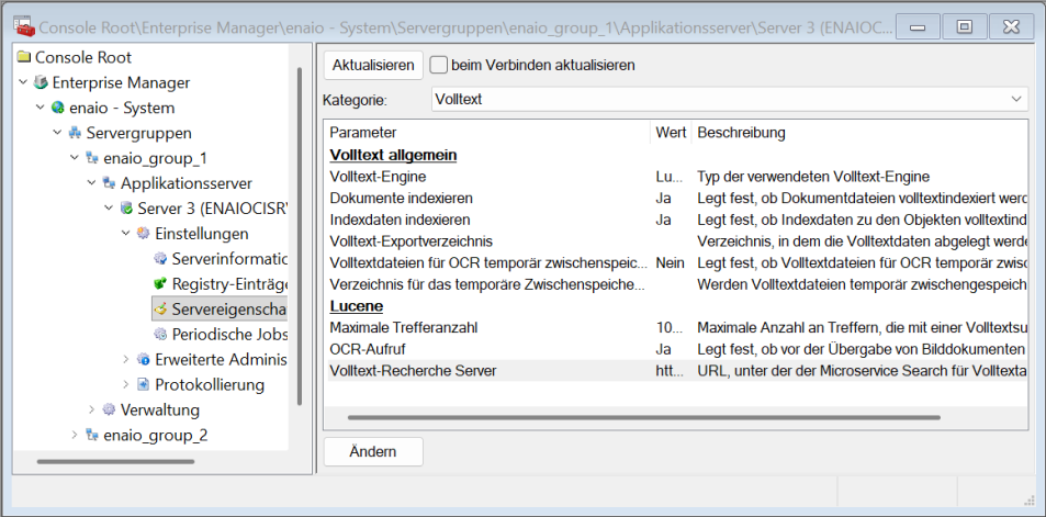 Bei der Administration von enaio® server über enaio® enterprise-manager geben Sie über Servereigenschaften > Kategorie: Volltext 'Lucene' als Typ der Volltextdatenbank an.