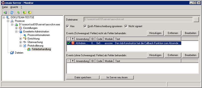 Ob ein Ereignis als Fehler gewertet wird oder ob nur eine Warnung ausgeben werden soll, ist häufig nicht klar im Vorfeld zu unterscheiden, sondern nur im Rahmen einer konkreten Installation. Deshalb ist es möglich, für enaio® server Listen von Ereignissen zu erstellen, die statt einer Fehlermeldung nur eine Warnung zur Folge haben und umgekehrt statt einer Warnung eine Fehlermeldung zur Folge haben.