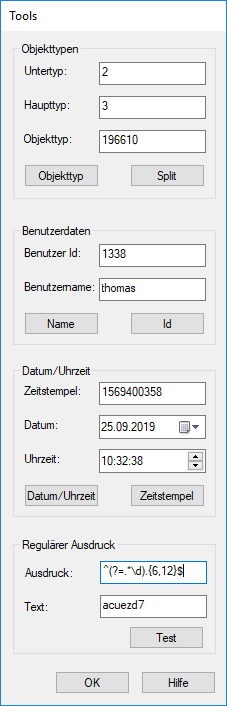 Here, you can enter a regular expression and check the Text field to determine whether or not the entry corresponds to the expression.