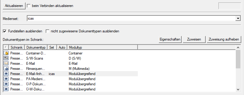 All document types are shown in the Connection to media area. You can assigned media sets to a document type and suspend assignments.