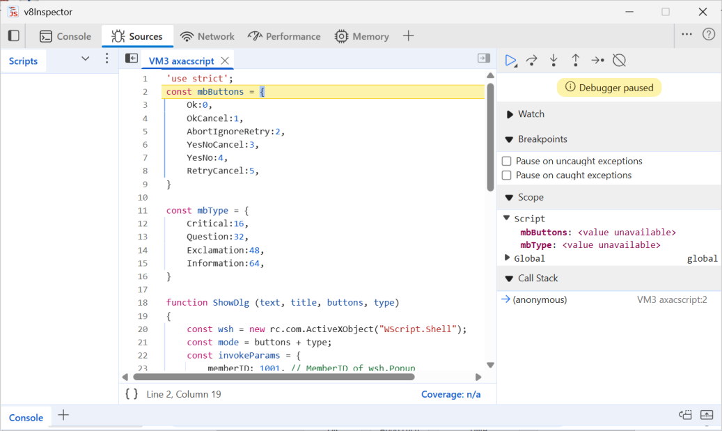 If a JavaScript is assigned to the 'Run script' action, the JavaScript can optionally be started in the debugger.