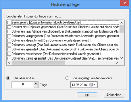 History maintenance can be used to remove editing history data from the database and documents from the document history according to specified date criteria.