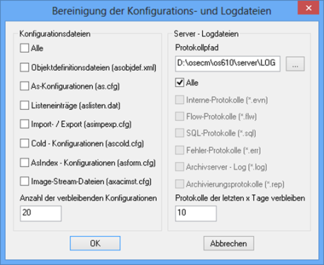 The 'Cleanup of configuration and log files' action deletes old versions of the configuration and server log files.