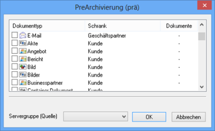 The 'Prearchiving' action passes all of a server group's documents that are not yet archived to the server group via which the automatic action is run. The documents are transferred to the WORK directory, and the modified server group assignment is added to the database.