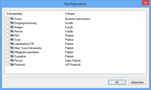 To set up the automatic action, enter a configuration name and choose the document types whose documents will be transferred in the configuration dialog. Also specify the server group to which the documents will be transferred.