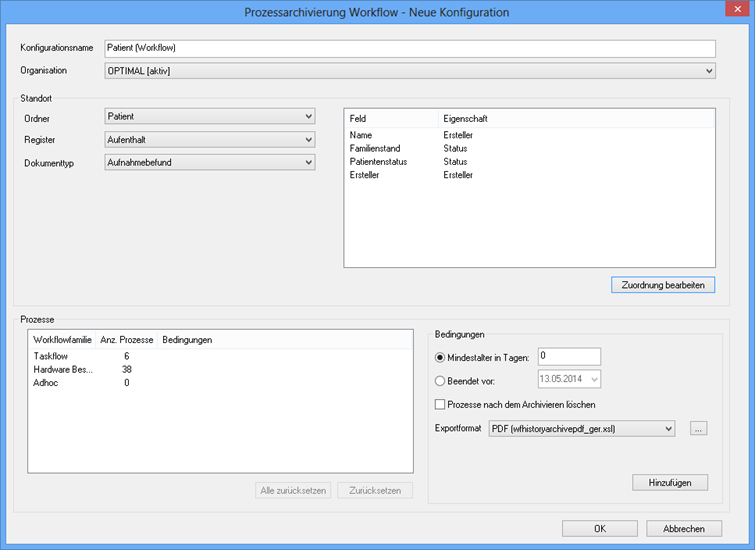 Select an entry and create a condition by specifying a minimum age in days or by date. You can additionally define whether to delete process data of archived processes.