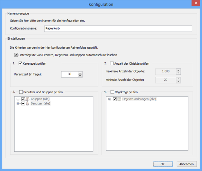 A configuration name is entered on the configuration dialog. The configuration name may not contain any spaces. Decide whether the contents of folders, registers, and portfolios will be deleted if they meet the deletion criteria.