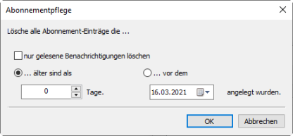 With the 'Subscription maintenance' automatic action you can remove subscription entries relating to all archive objects from the database according to specific date criteria.