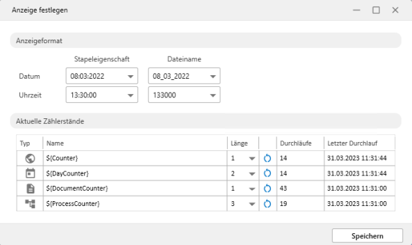 Counters that are automatically used in the runs are also configured here. The length can be specified for each counter. The current counter readings are shown and can be reset. The date of the last run is shown.