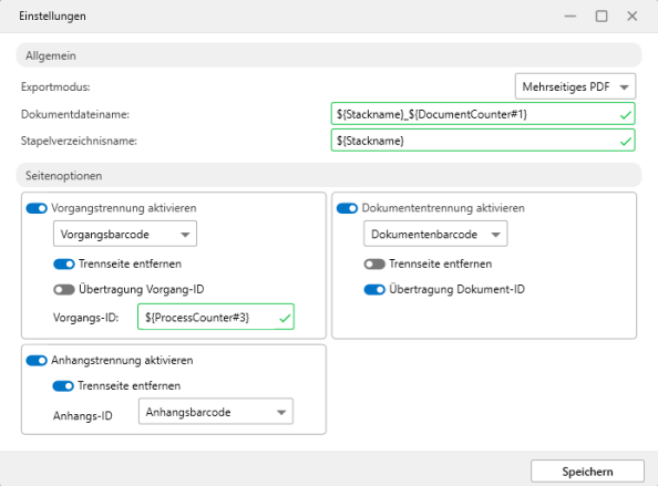 For each enable splitting, specify where the configured barcodes are located as the ID for splitting. You can have splitting pages removed.