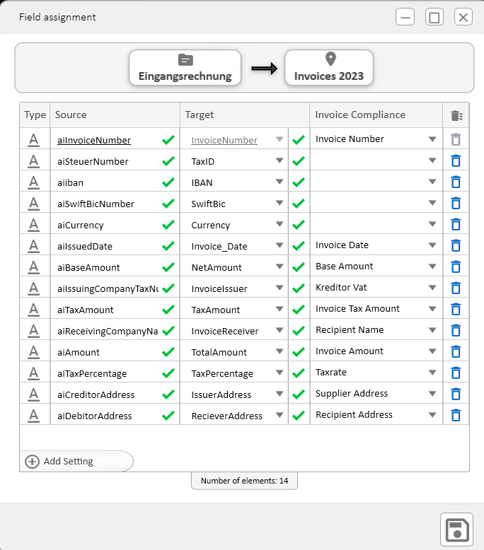 If the invoice conformity check is enabled, the required invoice conformity criteria will also need to be assigned to fields of the document type.