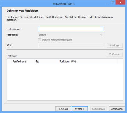 On this tab you can define, edit, or delete the indexing fields of the documents. For import, it is also possible to assign indexing fields of enaio® objects (see 'Field Mapping') to these indexing fields.