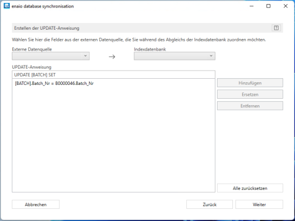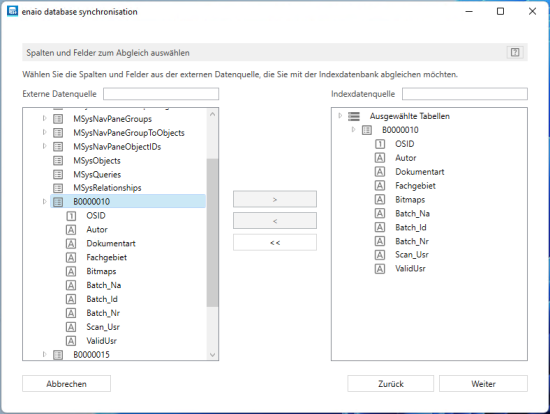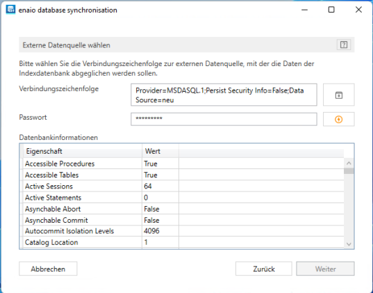 Set up a database connection to an external database and complete the value, search, and synchronization fields for enaio® database synchronization.