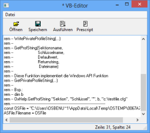 In VB Editor, scripts can be created or available scripts can be imported. Scripts which have not been provided by OPTIMAL SYSTEMS GmbH will need to be created or imported and saved in VB Editor. They are encrypted when they are saved and can only be run if they are encrypted. Scripts can be saved with a password and require additional licensing.