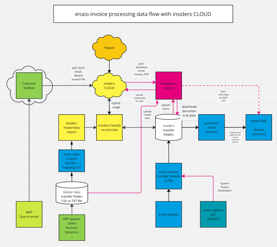 The 'classify-pro' service transfers documents and data between enaio® and the 'Invoice' subsystem of Insiders Cloud to extract metadata.