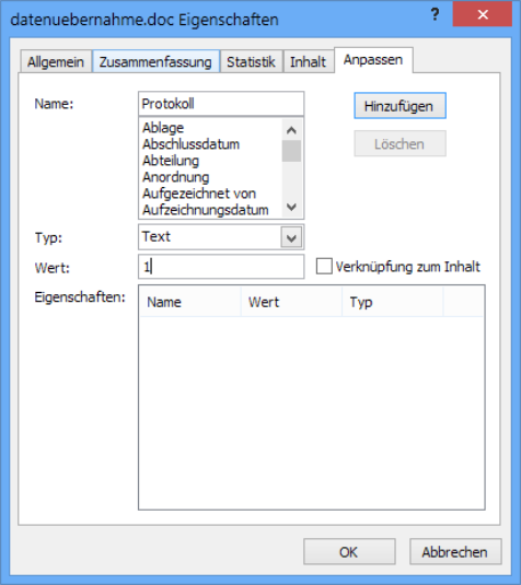 Für das jeweilige Dokument konfigurieren Sie die Datenübernahme über den Eigenschaften-Dialog des Dokuments in MS-Word.