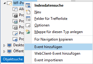 Um ein derartiges Client-Event zu erstellen, öffnen Sie im Bereich 'Objektsuche' das Kontextmenü des Objekttyps und wählen den Eintrag Event hinzufügen: