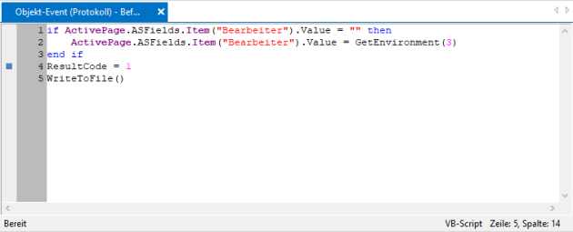 Falls kein Bearbeiter eingetragen wurde, wird der Benutzername des angemeldeten Benutzers ermittelt und in das Feld mit dem internen Namen 'Bearbeiter' geschrieben (Zeile 2).