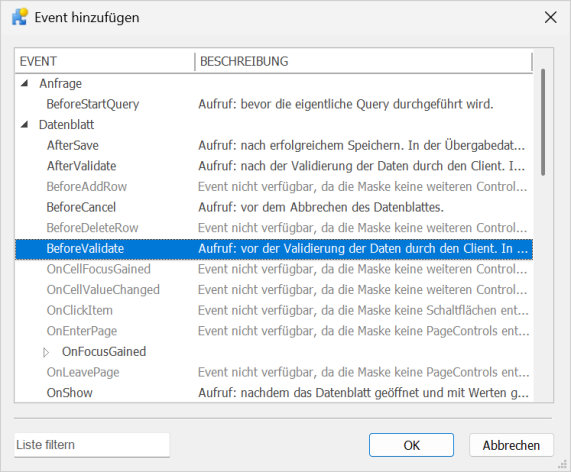 Im Dialog Event hinzufügen wählen Sie nun den Eintrag BeforeValidate aus und bestätigen mit OK: