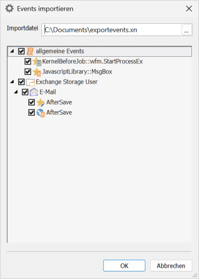 Beim Eventimport wählen Sie die XML-Datei mit den Zuordnungen und geben an, welche Events importiert werden sollen. Die Skripte müssen im gleichen Verzeichnis liegen wie die XML-Datei.