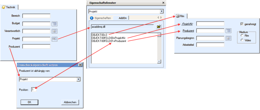 Das Quickfinder-Feld 'Technik/Projekt' übernimmt die Daten aus dem Feld 'Film/ProjektNr:' (OBJEKT00FELD00'). Das Feld 'Technik/Produzent' ist über die Crosscheckeigenschaft abhängig vom Quickfinder-Feld 'Technik/Projekt', hat die Positionsangabe '1' und erhält die Daten aus dem Feld 'Film/Produzent' (OBJEKT00FELD01').
