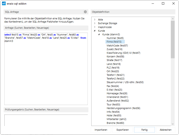 The SQL add-on executes an SQL select statement. The user can transfer one or more values from the hit list into the field. The add-on has a script interface.