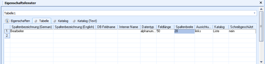 Here you can specify a column name for each column of the table, select the data type 'alphanumeric', 'numeric', 'date', or ‘decimal’, specify the maximum number of characters which the user can enter in the cell as the field length, specify the column width in the form, and select an alignment for the contents of the column from the list box list box. Columns can be set to read-only. The DB field name cannot be edited.