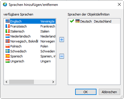 - Select an available language and then use the arrow keys to assign the object definition to the languages.
