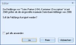 • Checks if the maximum database field length for text fields, such as those found in the default settings, has been exceeded by dialog elements.