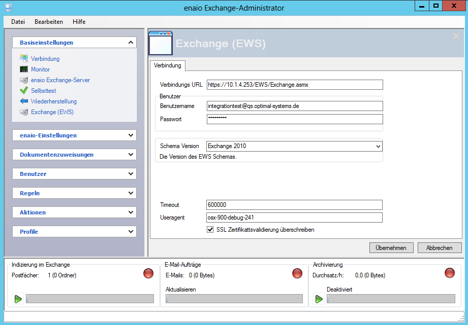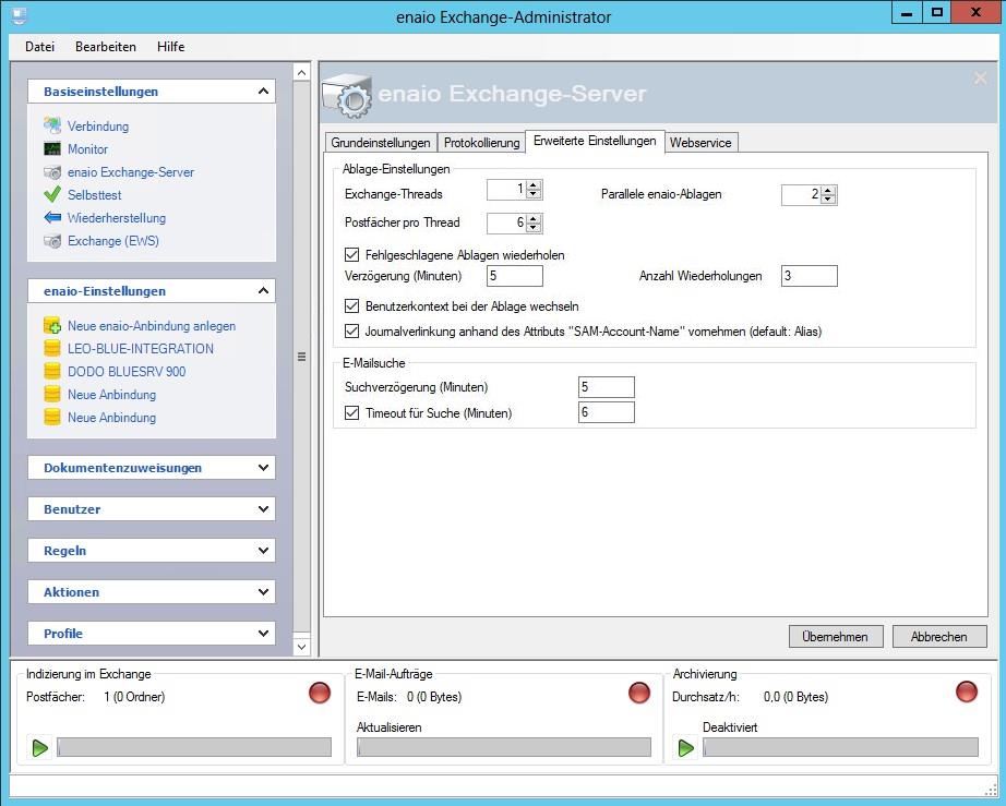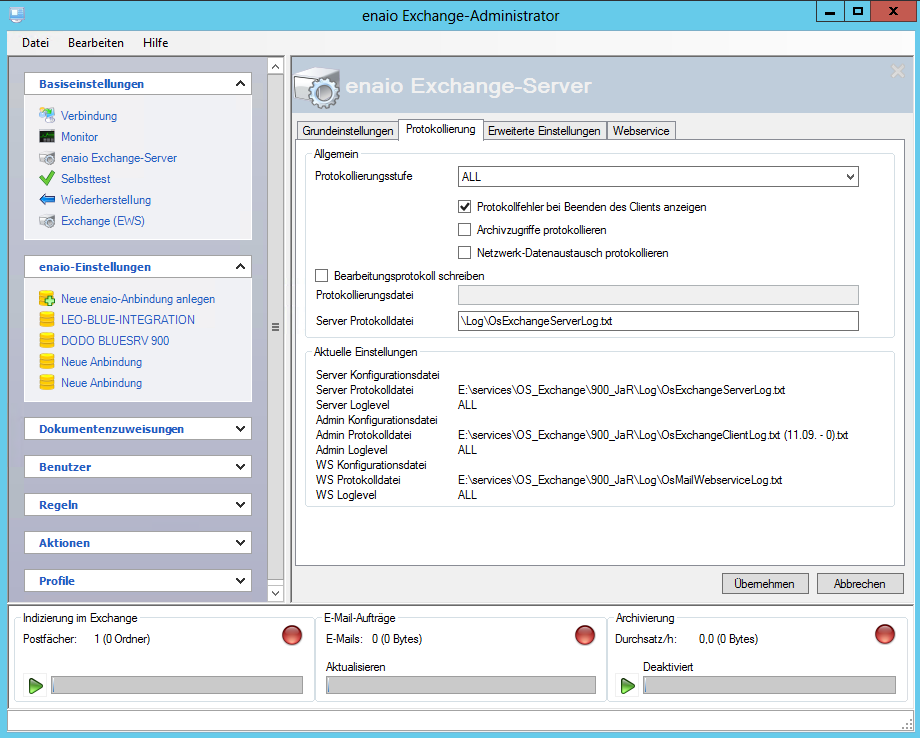 Hier stellen Sie die Verbindung zum enaio® exchange-server her und trennen Verbindungen wieder.
