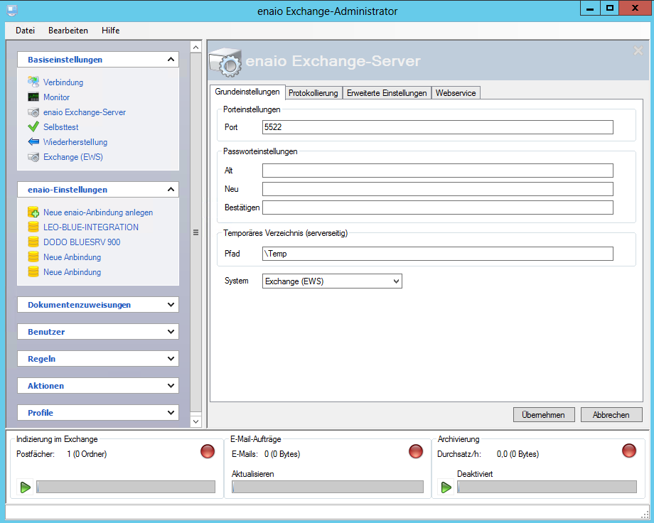 Wie über die enaio® exchange Konsole können Sie auch hier Port und Passwort für die Verbindung zum enaio® exchange-server ändern.